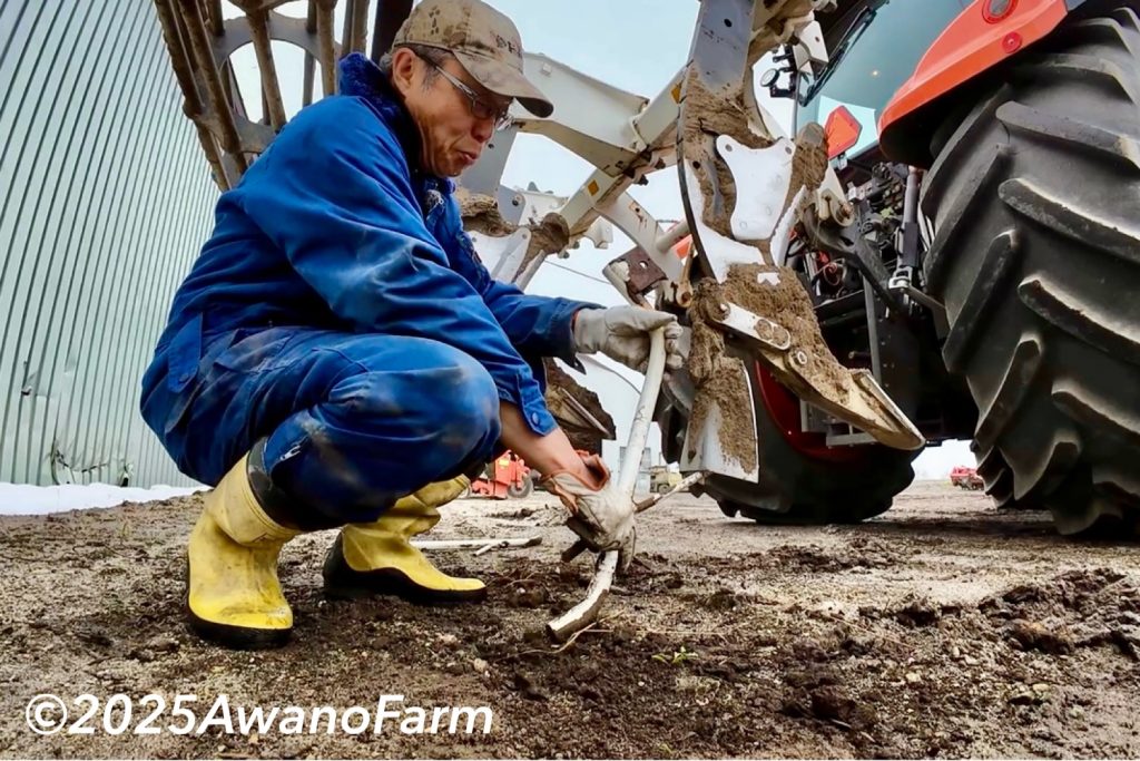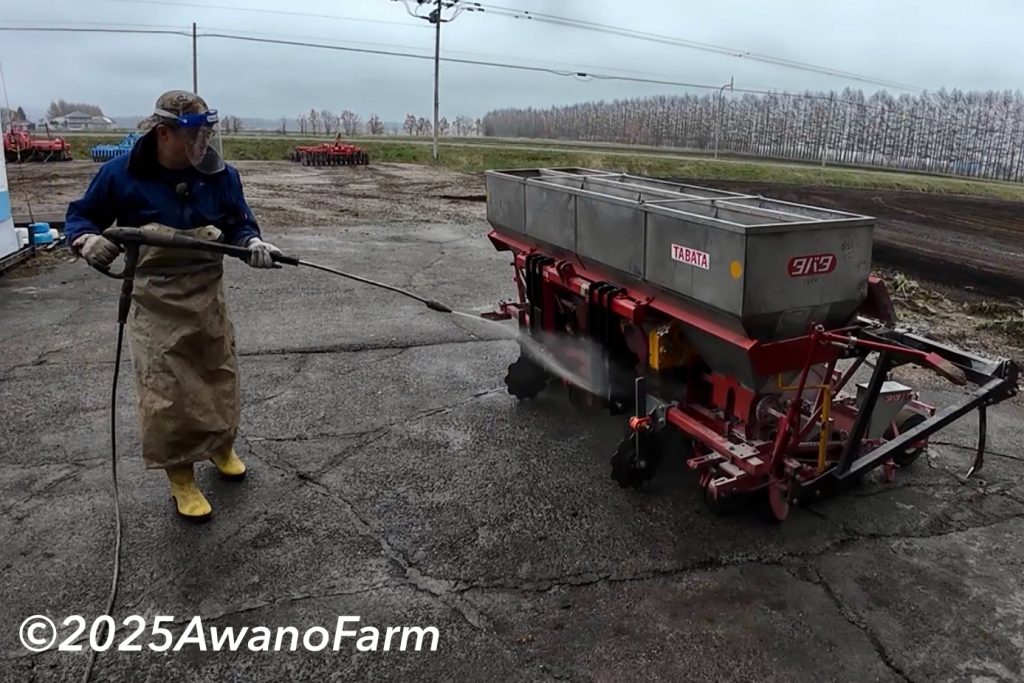 その前に、畑を見て回りました。小麦の生育もまずます、ビート畑は乾きつつあったのですが、霧雨のおかげでどんどん濡れてしまいます。機械整備は、ビートの播種で使ったタバタのプランターを洗浄しました。霧雨なので、倉庫の中で乾かしました。あとは、ハーフソイラを外してジャガイモの整地で使うパラディスクの準備等々を行いました。今回は整備前半の様子です。
