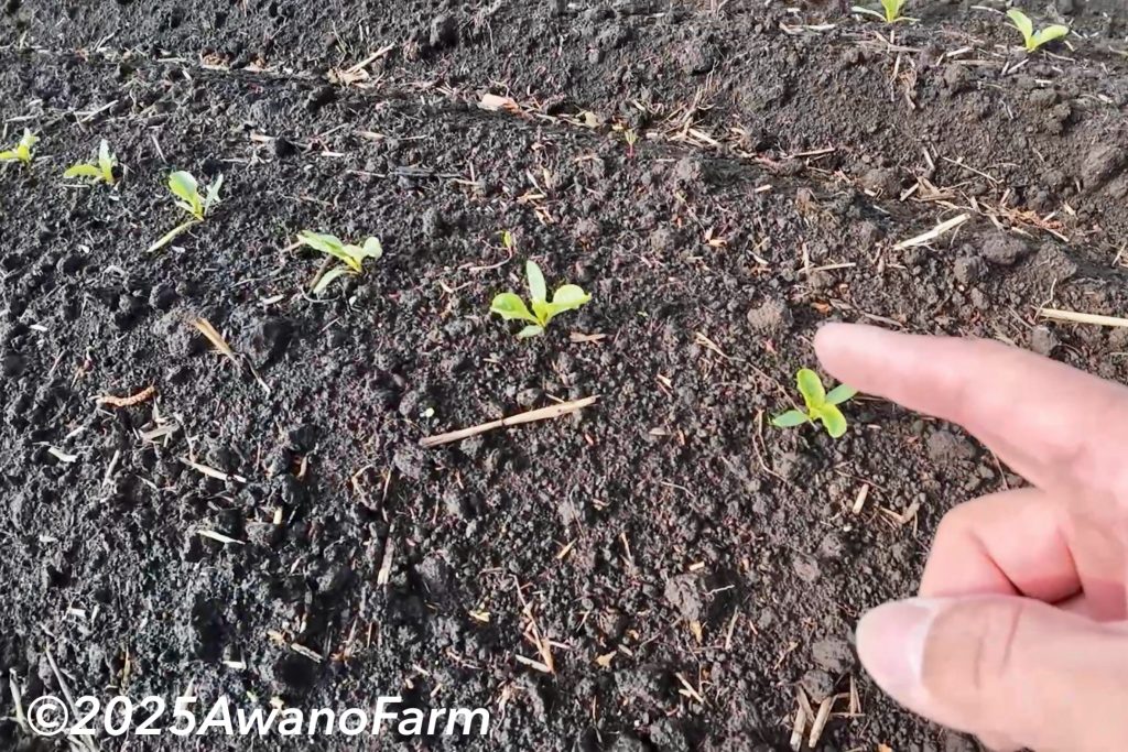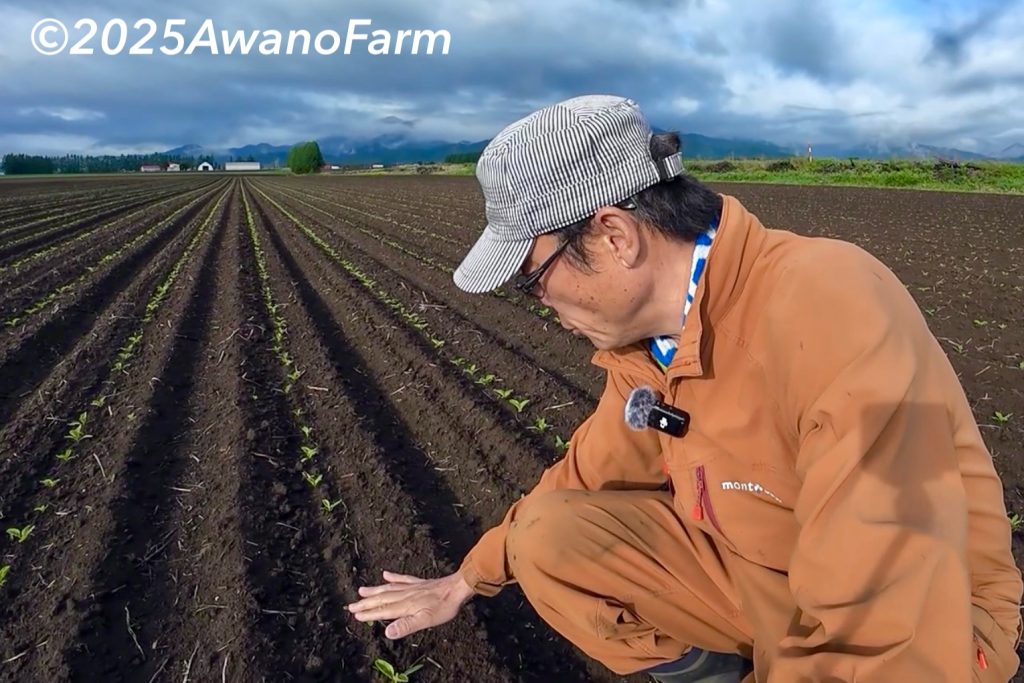前日までの雨量は24ミリと、期待以上に降ってくれちゃいました。畑作業は無理なので、作付けの終えた畑の状況を見て歩きました。まずは気になるビートの発芽状況です。タバタ農機のプランター播種も、サタナスアルミ種板のおかげでとても精度良く発芽していました。そして初めて使わせて頂いたサークル機工ロール式可変施肥播種機でしたが、これまた精度がとても良く綺麗に発芽していました。ロール式は落下する時に、左右にブレが少ないと思われます。播種深度も正確なようです。あとは小麦やジャガイモ、大豆の様子を見て歩きました。気になるのは気温が低いことで、十勝幌尻岳は白く雪化粧していました。