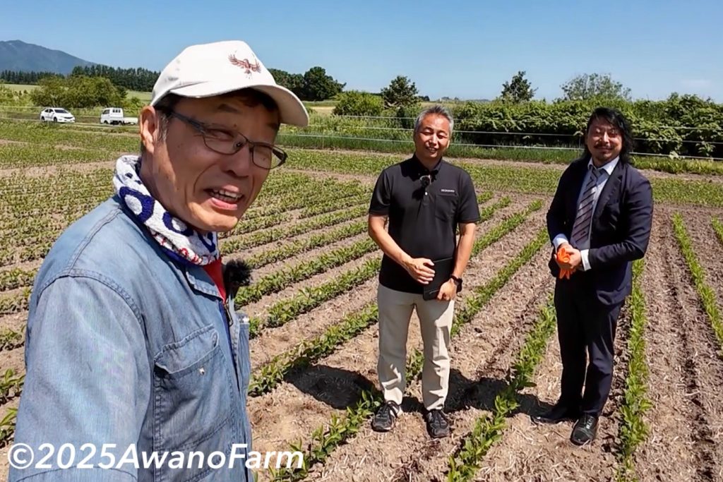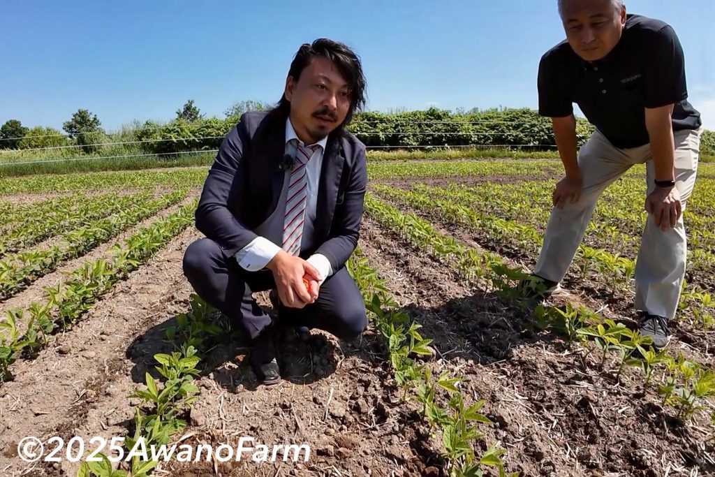 2025年6月24日前田さんがビコンさんと一緒に大豆の発芽状態を見に来てくれました。