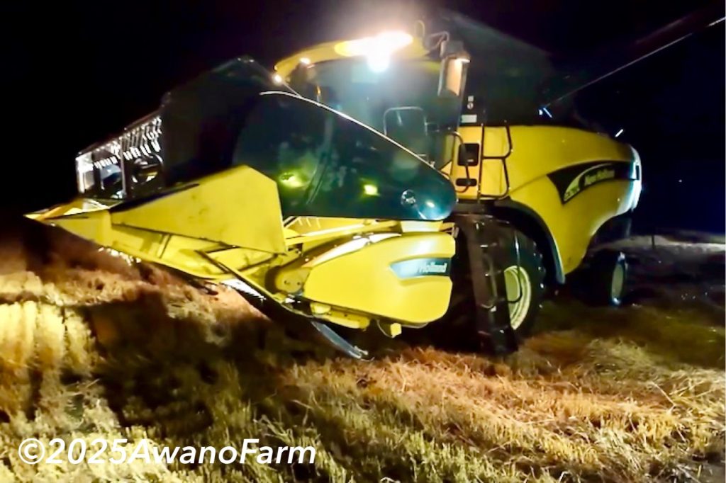 12年ぶりのコンバインに、少し緊張しながら刈り取りを行いました。やってみると意外と上手く刈り取りが出来て、ホッとしました。外周を主に請け負って、倒伏等もガンガン刈り取りました。だんだん日が暮れて、湿っぽくなってきましたが夜9時まで頑張って刈り取り作業を行いました。とりあえず、ミスも無く無事にこの日の刈り取りは終える事が出来ました。皆さんお疲れ様でした!