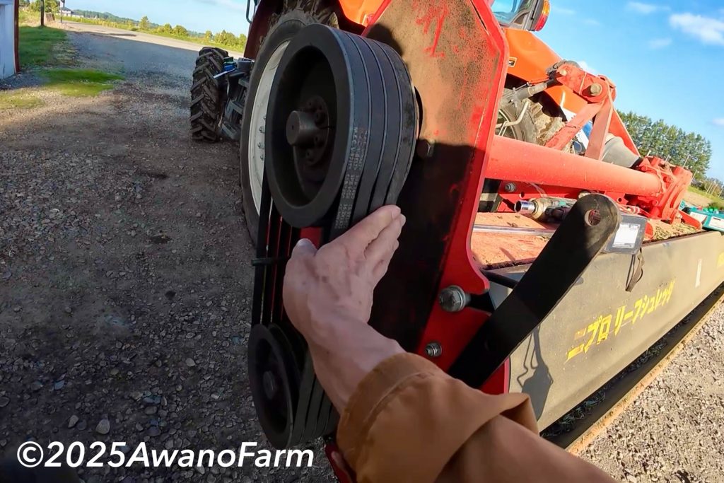 毎年色々な方法で緑肥を処理していますが、今年はリーフシュレッダーで処理することにしました。お借りしているクボタジェネストプラスで絶好調に作業を進めていましたが、途中で異音を発しながら止まってしまいました。降りて見てみると焦臭い臭いがしています。どうもベルトが滑っているようで、クボタの花澤さんに見に来てもらいました。
