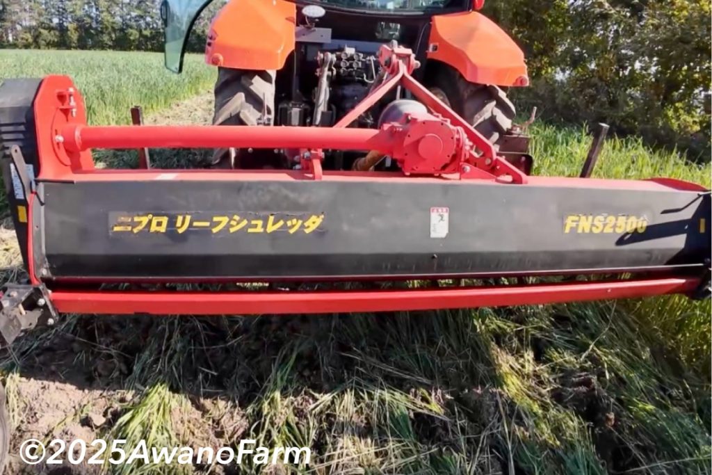 2025年10月14日小麦収穫後に播種した緑肥の細断作業を行いました。