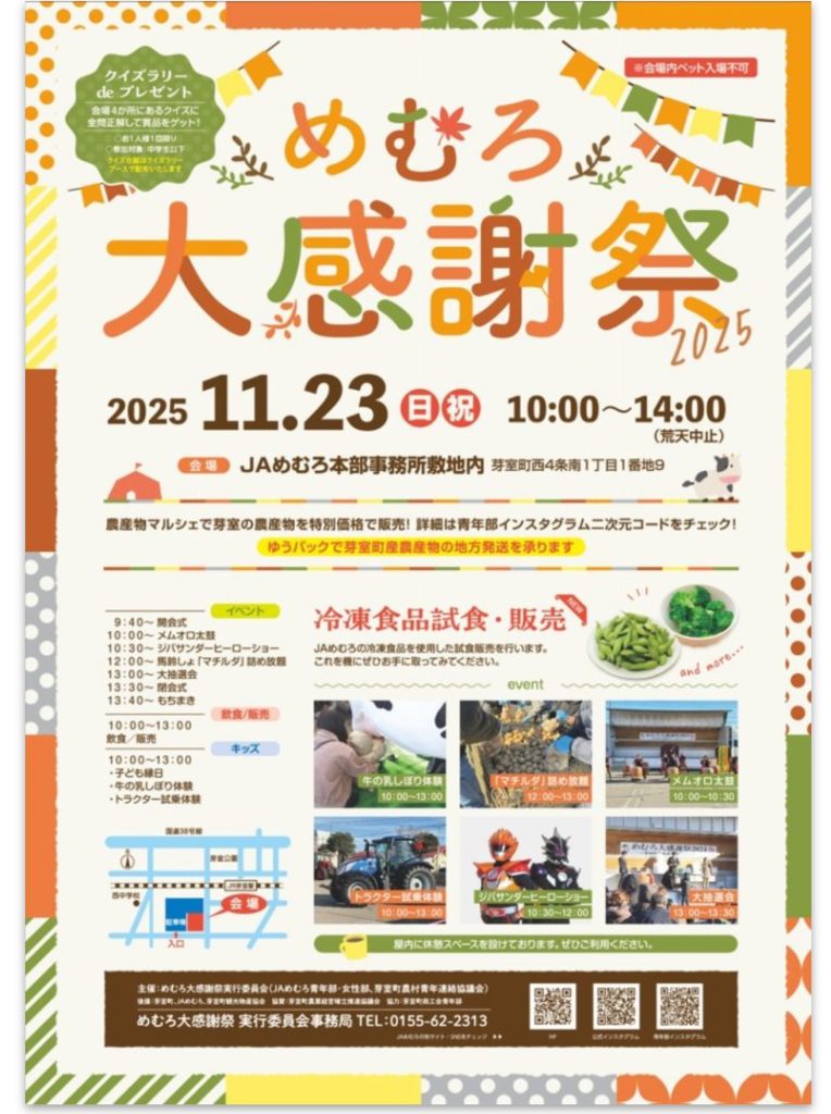 開催日2025年11月23日日祝10:00~14:00(荒天中止)会場 JAめむろ本部事務所敷地内 芽室町西4条南1丁目1番地9