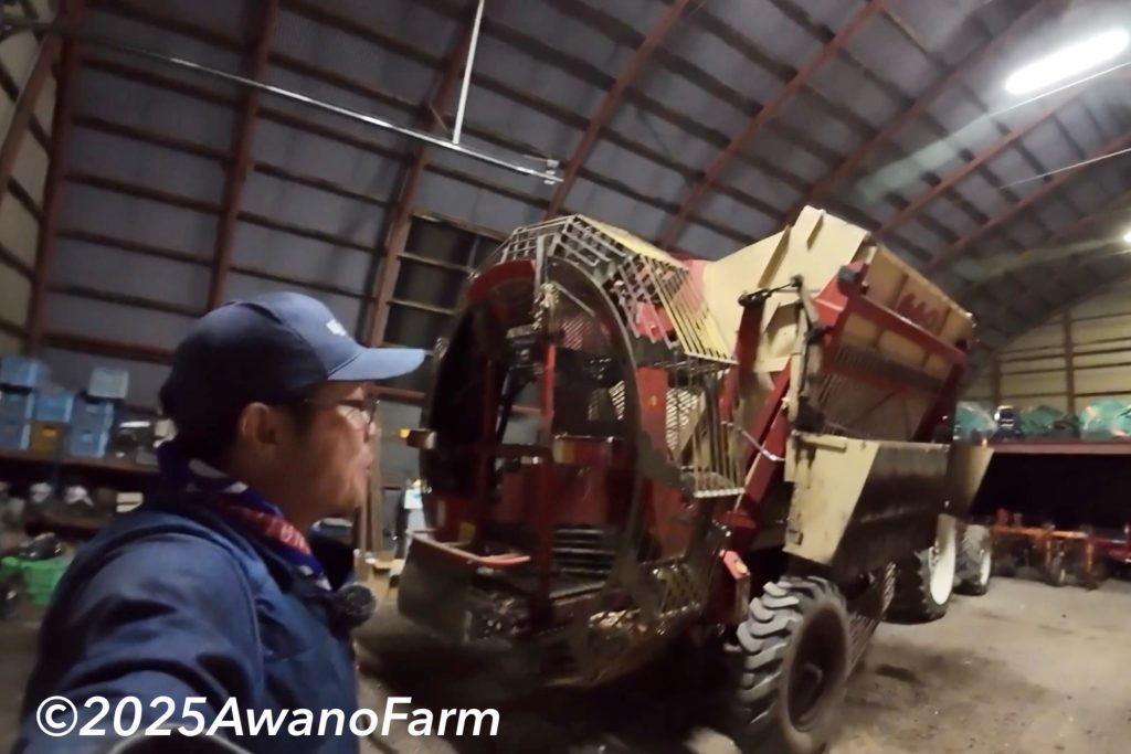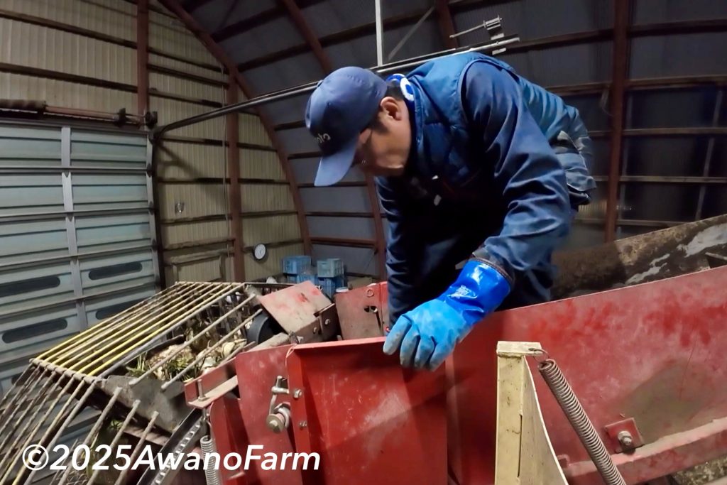 朝から順調にビートの収穫を行っていましたが、日が暮れた頃ハーベスターの上のコンベアが動かなくなってしまいました。なにかが挟まっているんだろうとは思いましたが、暗くなったので倉庫で調べてみました。案の定、昨年伐採した防風林の太い枝が挟まっていました。なんとか取り除いて、次の日も収穫を続けました。
