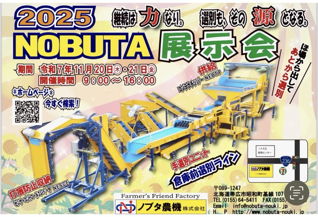 今年の春にリフトから落として壊してしまった種芋選別に使っていた選別機でしたが、ノブタ農機さんで直してもらえるとのことで軽トラックに乗せて運びました。軽トラに載せてみるとはみ出していたので計ってみましたが、道路交通法違反にはならないようなのでバンドでしっかりと縛って運びました。工場に到着して無事に下ろしてもらいました。ノブタ農機さんでは今月11月20・21日と展示会を開催するそうで、梶さんから紹介を頂きました。とても盛りだくさんの展示会を予定されているようで、私も時間が合えば見に行きたいと思っています。