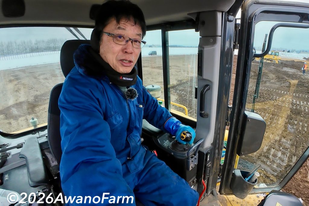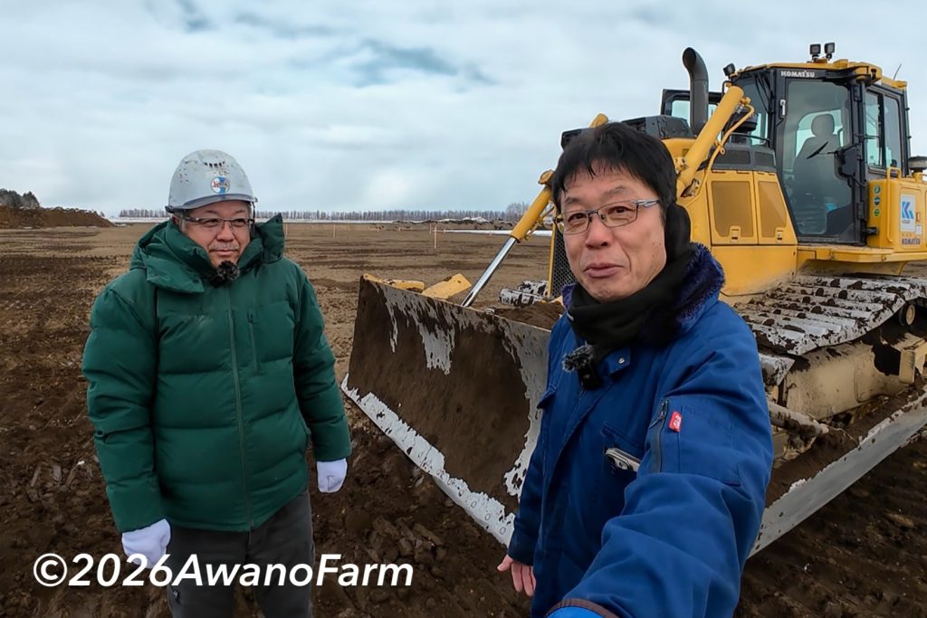 昨年11月から土壌改良事業で客土の土取りと畑の均平工事を行なってくれていましたが、いよいよ最終となってきました。表土埋め戻しの立ち会いに行ってきました。大型ブルドーザー3台で埋め戻し作業を行なってくれていましたが、その中のお1人が私の動画の視聴者様でした。作業を止めて頂き、お会いさせて頂きました。本別から来られている山川さんは、3ヶ月前からご覧いただいているという事で本当にうれしい限りです。今回特別にブルドーザーに座らせてもらいました。ブルはデカいですねー!お孫ちゃんに見せてあげたくなりました。今回は河合ローダー皆さま、特別のご配慮ありがとうございました。
