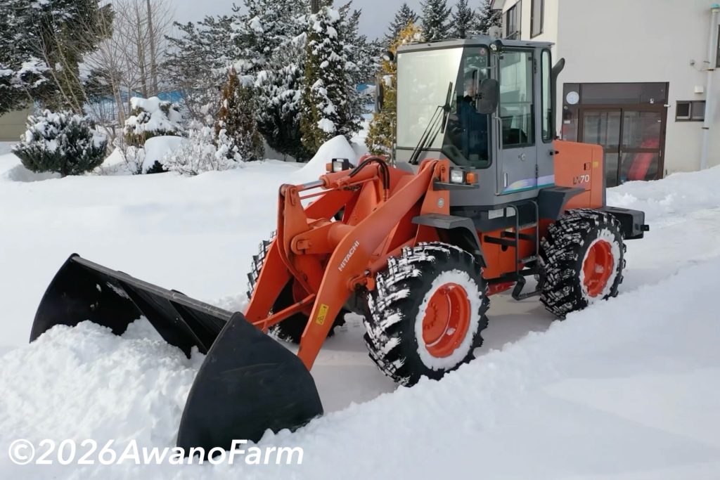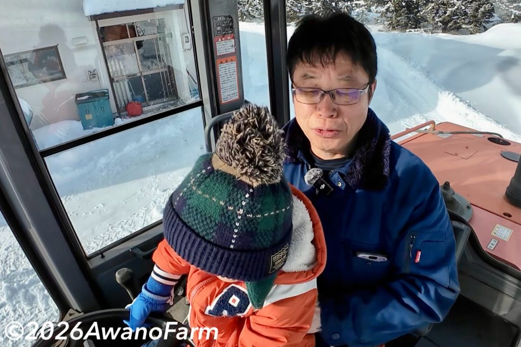 朝起きると雪が積もっていました。予想よりも多く、約22cmの積雪となりました。ホイールローダーのバケットにアクセルFGを塗布して作業スタートです。軽い雪だったので除雪作業はあっという間に終わりました。その後はお孫ちゃん達が遊びに来ているので、滑り台を滑りやすく固めておきました。お孫ちゃん2号君は外で遊ぶのが大好きなので、一緒にホイールローダーに座ったりソリ遊びをしました。将来は農家をやりたいと宣言するお孫ちゃん2号君にデレデレのオジジでした。